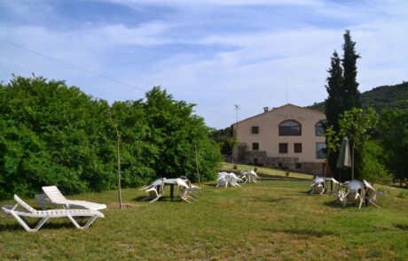 Al voltant de la masia hi ha zones enjardinades amb taules, cadires i gandules.
